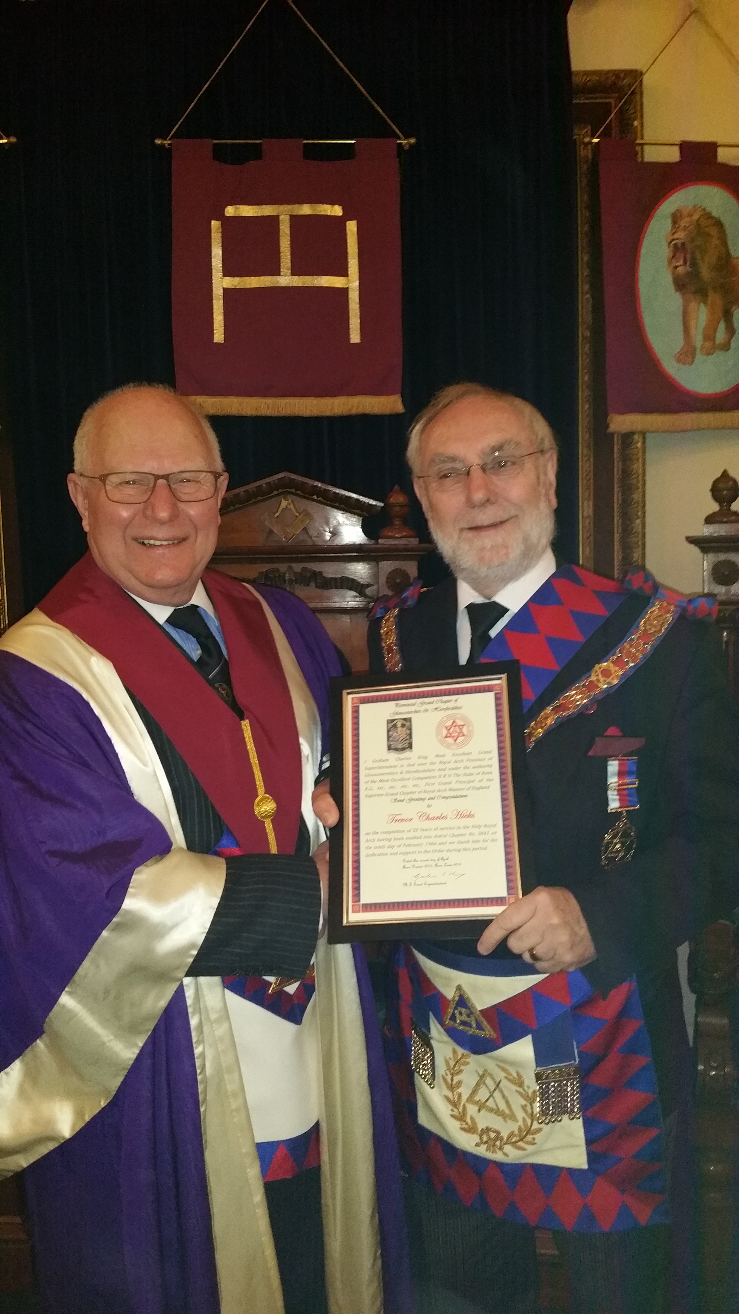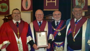 It came as a bit of a surprise to E Comp Trevor Hicks when during the risings he was called forward to receive a certificate to commemorate his 50 years as a Royal Arch Mason. The occasion was the Spring Meeting of Innsworth Chapter on Saturday 2nd April in Gloucester. Trevor received his certificate from the Deputy Grand Superintendent E Comp Ray Bennett. It was very much an Innsworth affair because Ray is also the Chapter’s IPZ. Trevor who is currently Innsworth’s 2nd Principal was exalted into the Royal Arch in Astral Chapter No 3841 on 10th February 1966 while stationed in Lincolnshire with the Royal Air Force. He remarked when accepting the certificate that it was most pleasing that his RAF connection with Royal Arch remained so strong some 50 years on through his membership of Innsworth Chapter. Earlier in the proceedings Trevor had been elected as Innsworth’s next 1st Principal which drew a comment from the Deputy Grand Superintendent on the uniqueness of presenting a 50 year certificate to a Companion yet to achieve the 1st Principal’s Chair.