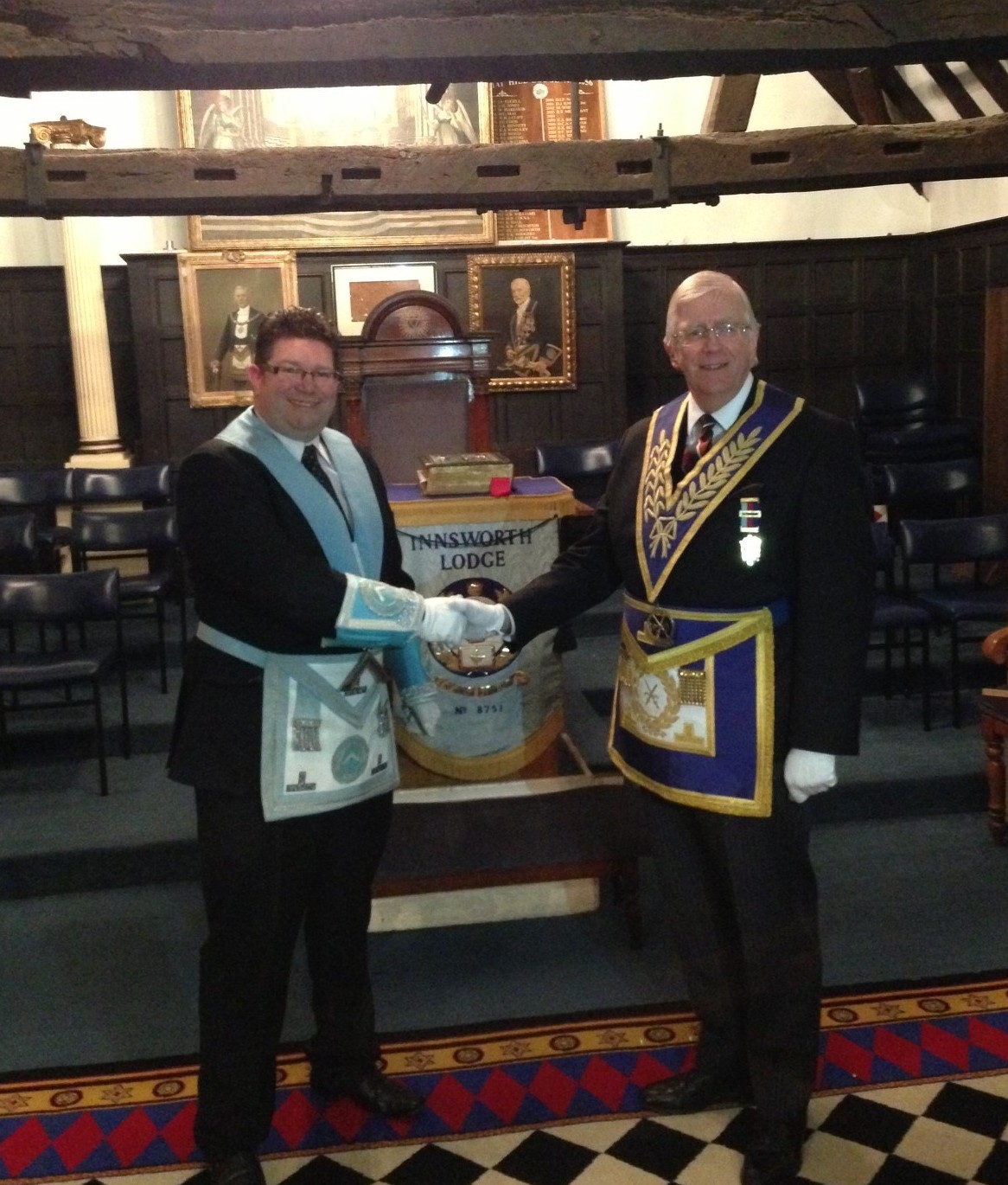 The Worshipful Master, WBro Andy Skelton congratulating WBro Peter Brindle Assistant Grand Sword Bearer
