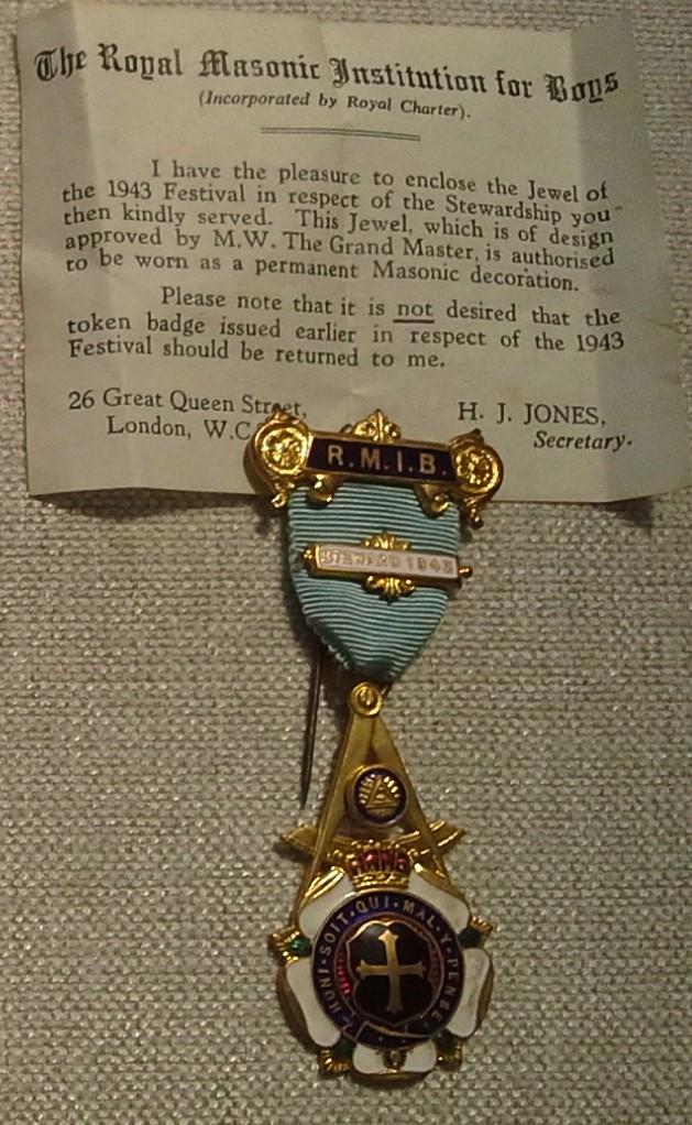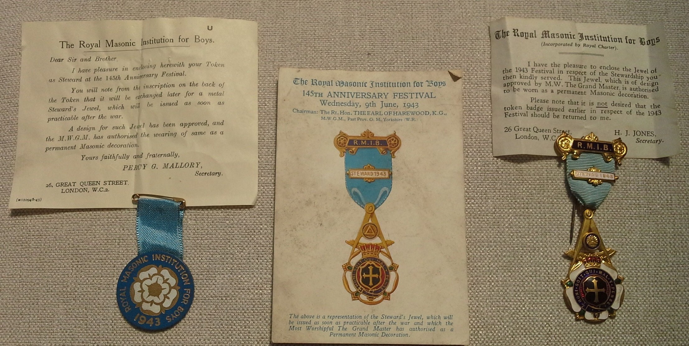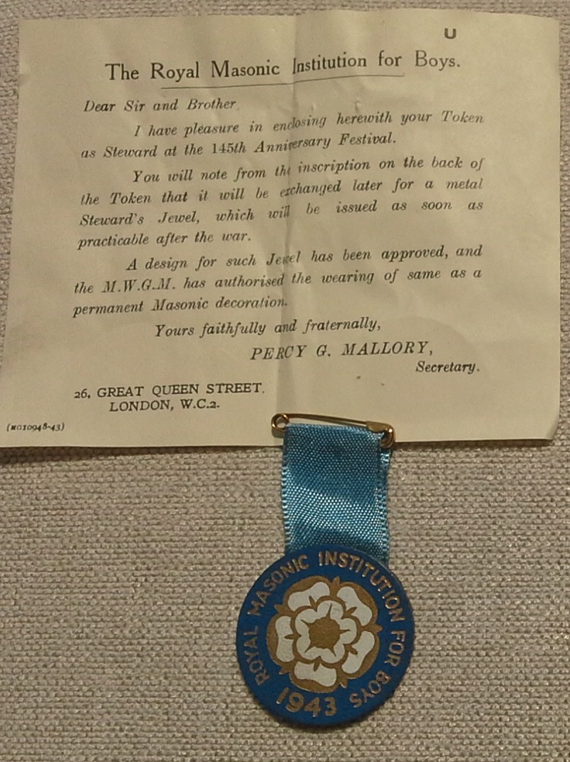 1. A brief letter from the Secretary of The Royal Masonic Institution for Boys, which advised the donor that he had been sent a “token” as Steward at the 145th Anniversary Festival, and that it would be exchanged later for a metal Steward’s Jewel, as soon as practicable after the war.