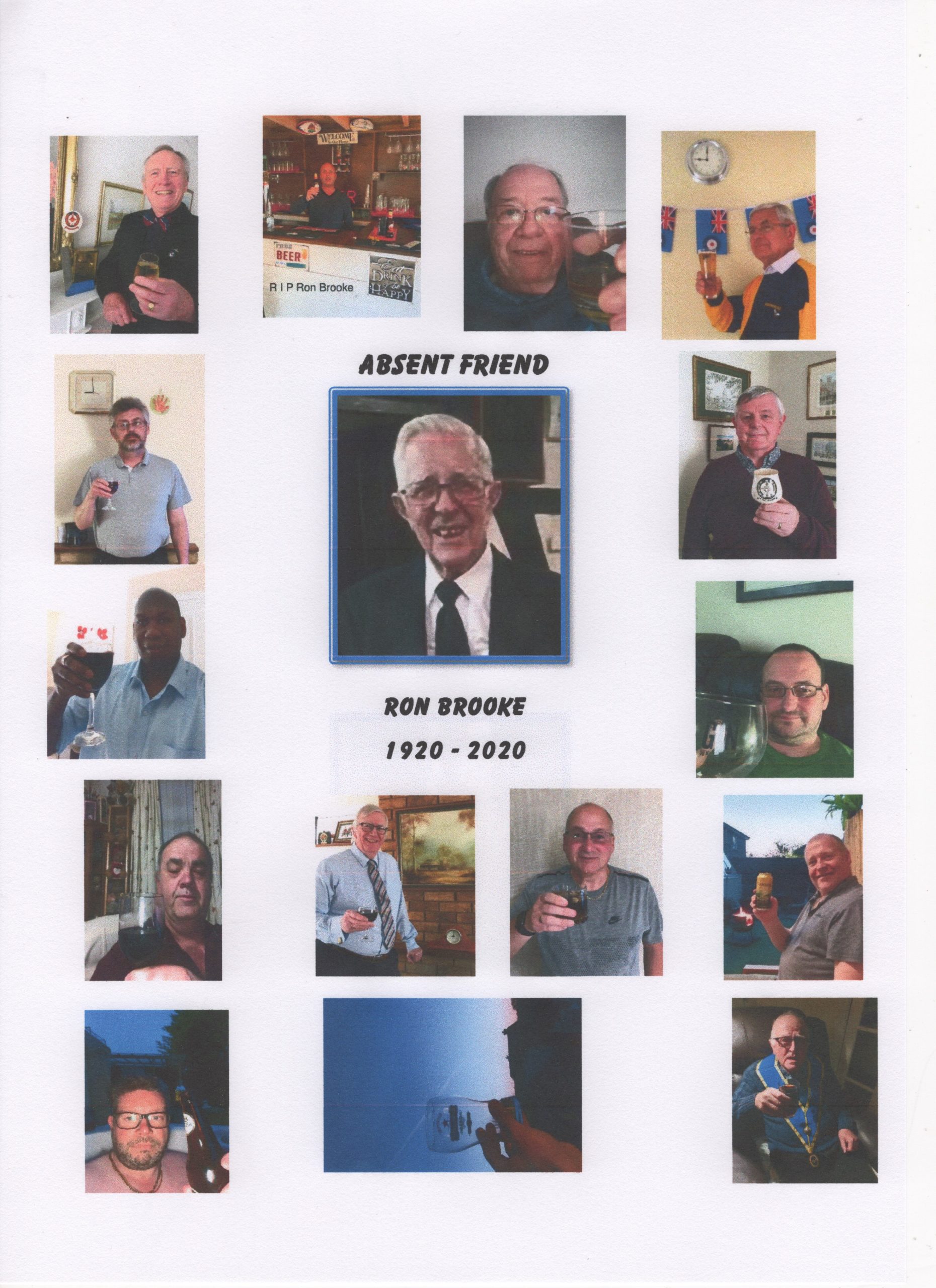 The WM of Innsworth Lodge, W Bro Bryan Roberts, decided that he would like the Brethren to make the effort to have a private minute’s silence and raise a glass, to honour Ron’s memory at 2100 hours on 25 April. He asked each one of them, that could, to take a photo or selfie toasting Ron at that time, for publication in the Gloucestershire Masonic Chain. A “Lockdown” tribute to honour their dear, departed Brother and Friend – a “virtual tribute” from the Lodge.